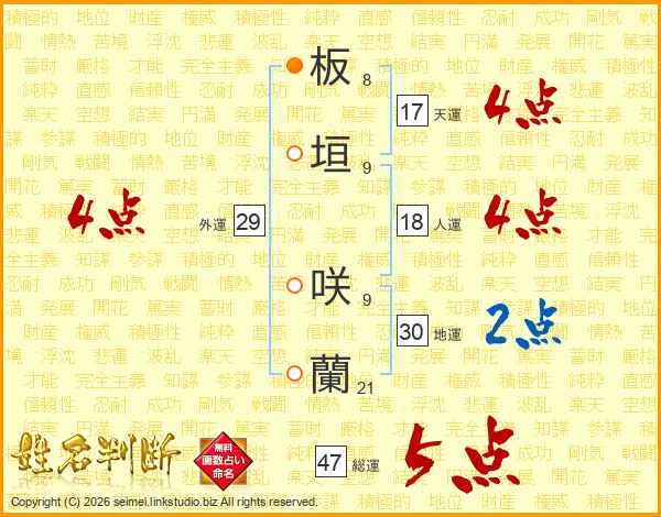 板垣咲蘭さんの総運は47画の5点!