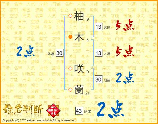 柚(9画)木(4画) 咲(9画)蘭(21画)
