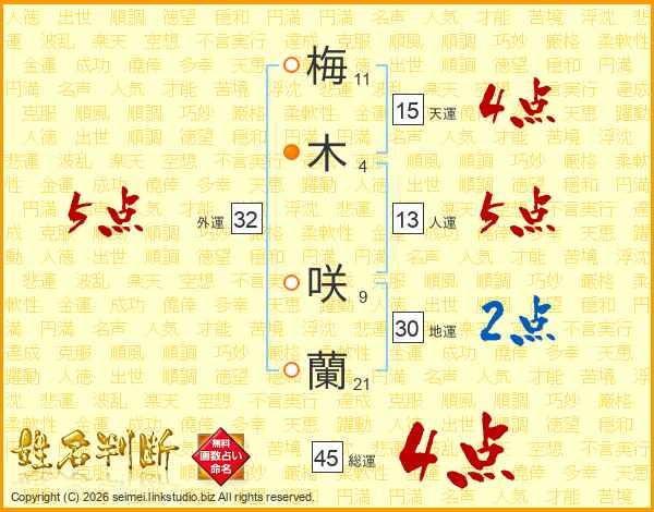 梅木咲蘭さんの総運は45画の4点!