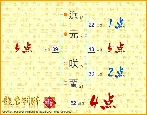 浜元咲蘭さんの総運は52画の4点!