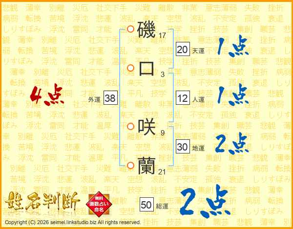 磯(17画)口(3画) 咲(9画)蘭(21画)
