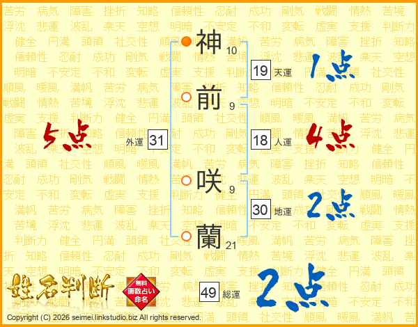 神(10画)前(9画) 咲(9画)蘭(21画)