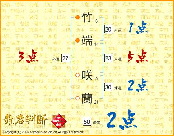 竹(6画)端(14画) 咲(9画)蘭(21画)