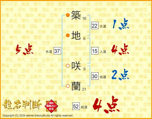 築地咲蘭さんの総運は52画の4点!