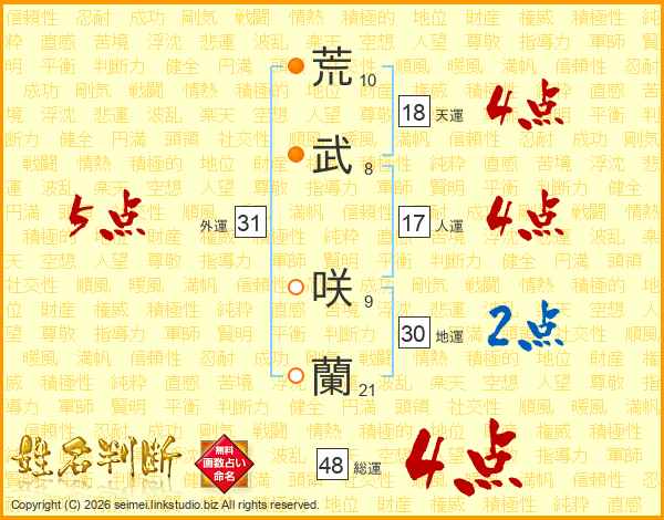 荒(10画)武(8画) 咲(9画)蘭(21画)