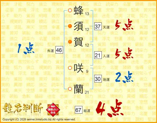 蜂(13画)須(12画)賀(12画) 咲(9画)蘭(21画)