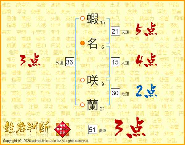 蝦(15画)名(6画) 咲(9画)蘭(21画)