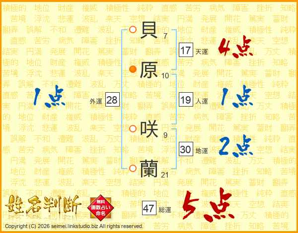貝(7画)原(10画) 咲(9画)蘭(21画)