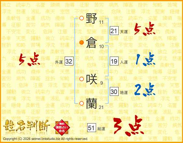 野(11画)倉(10画) 咲(9画)蘭(21画)