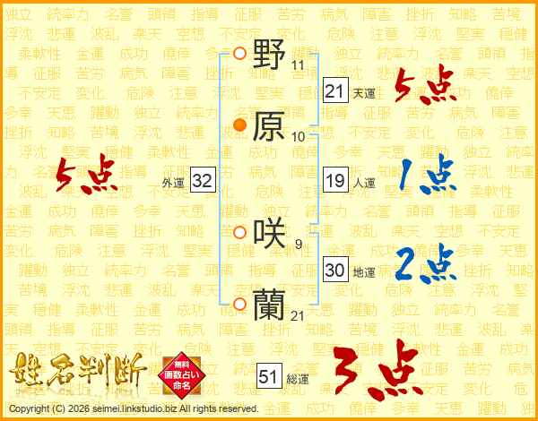 野原咲蘭さんの総運は51画の3点!