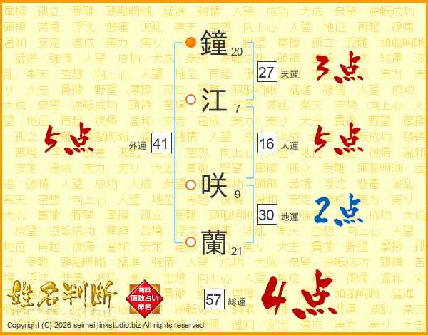 鐘江咲蘭さんの総運は57画の4点!