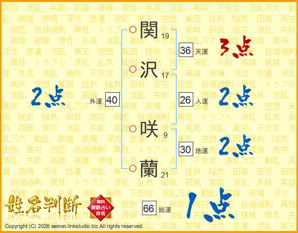 関(19画)沢(17画) 咲(9画)蘭(21画)