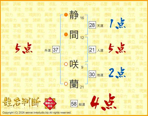 静(16画)間(12画) 咲(9画)蘭(21画)