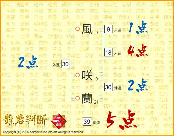 生活面を象徴する運勢です。外部から受ける影響力を表し、結婚運、家庭運や職場、環境への順応性を表します。総運から人運を引いた画数。姓や名が1文字の場合を除く。