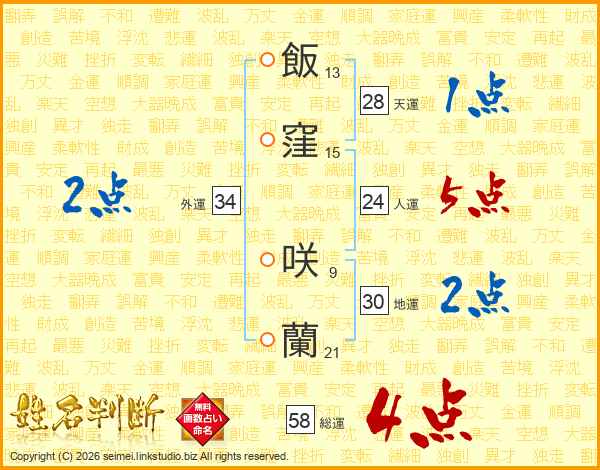 飯(13画)窪(15画) 咲(9画)蘭(21画)