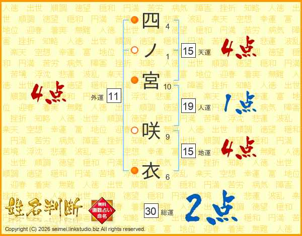 四(4画)ノ(1画)宮(10画) 咲(9画)衣(6画)