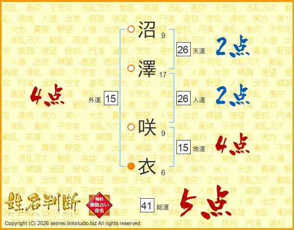 沼澤咲衣さんの総運は41画の5点!