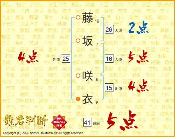 藤(19画)坂(7画) 咲(9画)衣(6画)