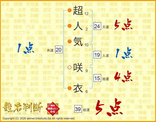 超(12画)人(2画)気(10画) 咲(9画)衣(6画)