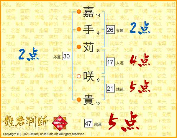 嘉手苅咲貴さんの天運は26画の2点!