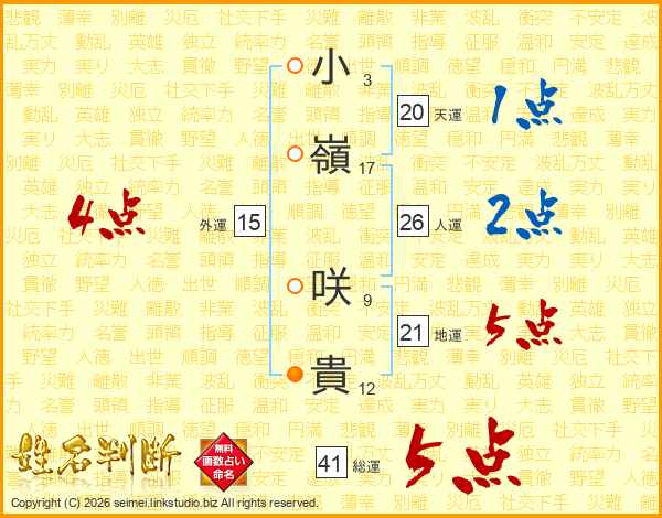 小(3画)嶺(17画) 咲(9画)貴(12画)