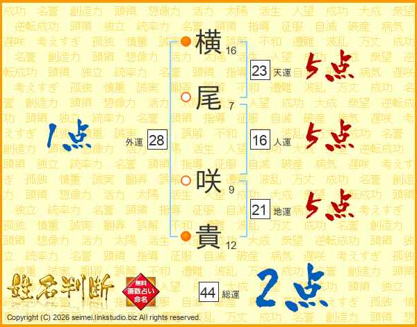 横(16画)尾(7画) 咲(9画)貴(12画)