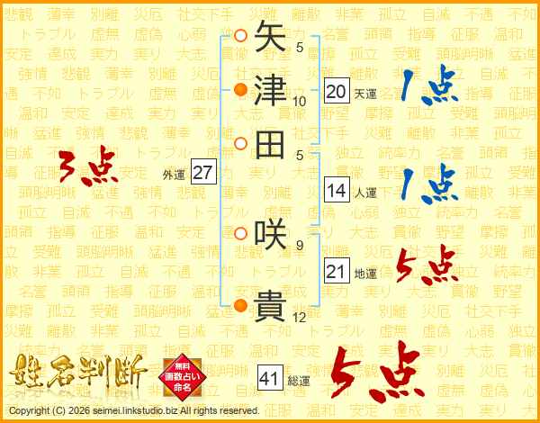 矢(5画)津(10画)田(5画) 咲(9画)貴(12画)