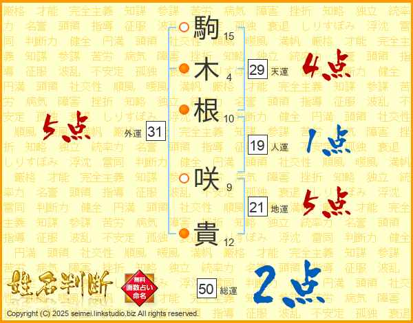 駒(15画)木(4画)根(10画) 咲(9画)貴(12画)
