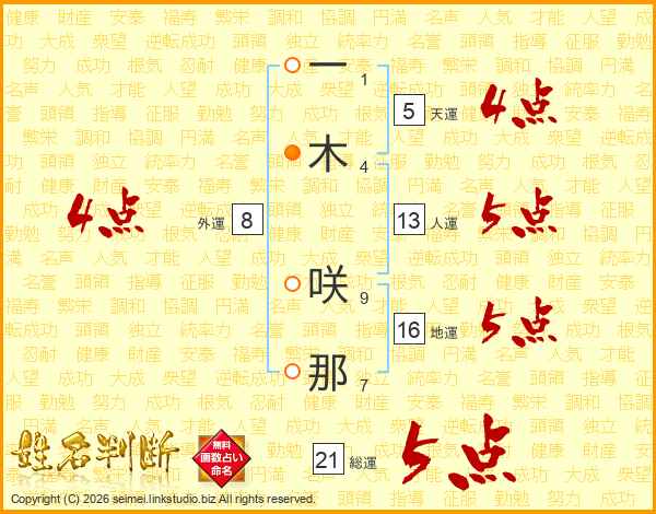 生活面を象徴する運勢です。外部から受ける影響力を表し、結婚運、家庭運や職場、環境への順応性を表します。総運から人運を引いた画数。姓や名が1文字の場合を除く。