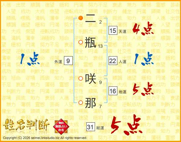 二(2画)瓶(13画) 咲(9画)那(7画)