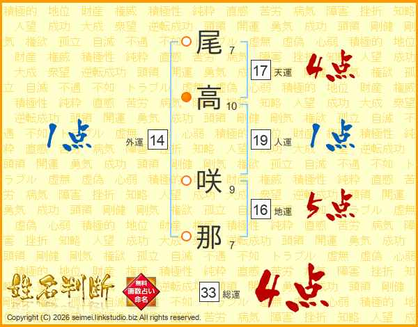 生活面を象徴する運勢です。外部から受ける影響力を表し、結婚運、家庭運や職場、環境への順応性を表します。総運から人運を引いた画数。姓や名が1文字の場合を除く。