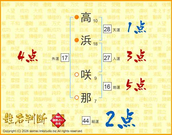 高(10画)浜(18画) 咲(9画)那(7画)