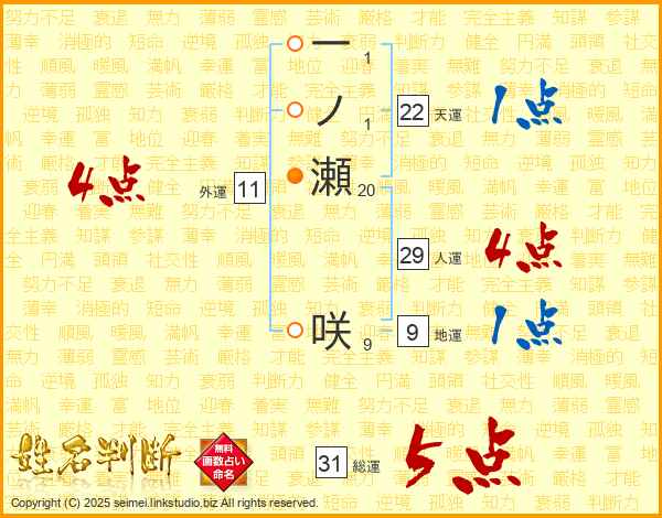 一ノ瀬咲さんの総運は31画の5点!