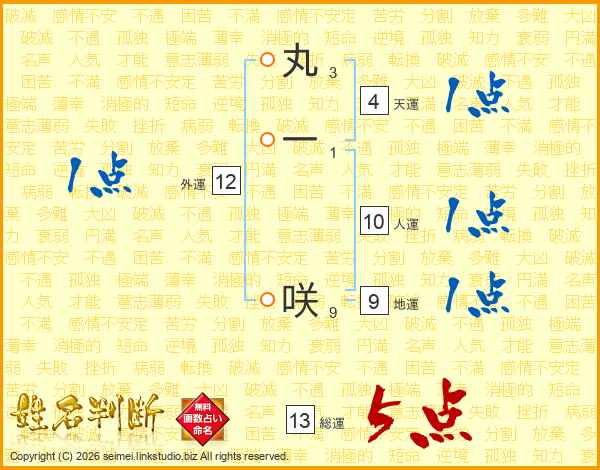 丸一咲さんの総運は13画の5点!