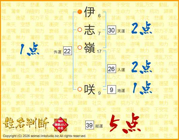 伊志嶺咲さんの総運は39画の5点!