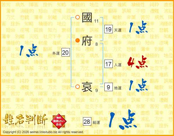 生活面を象徴する運勢です。外部から受ける影響力を表し、結婚運、家庭運や職場、環境への順応性を表します。総運から人運を引いた画数。姓や名が1文字の場合を除く。