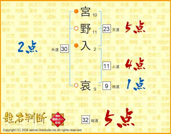 生活面を象徴する運勢です。外部から受ける影響力を表し、結婚運、家庭運や職場、環境への順応性を表します。総運から人運を引いた画数。姓や名が1文字の場合を除く。