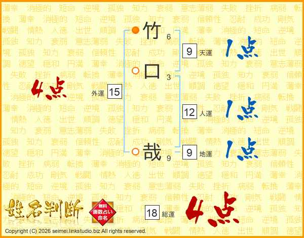 竹(6画)口(3画) 哉(9画)