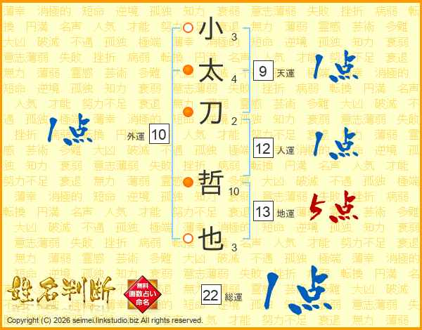 小太刀哲也さんの総運は22画の1点!