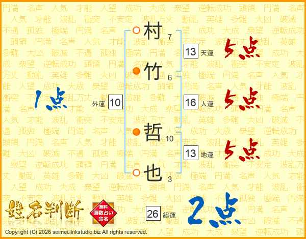 あなたの人生を表す1番重要な運勢です。生涯を通じて影響する総合運となり、主に50歳以降の晩年期に影響を及ぼします。苗字と名前の合計画数。