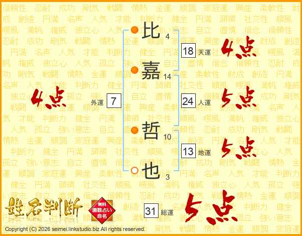 比(4画)嘉(14画) 哲(10画)也(3画)