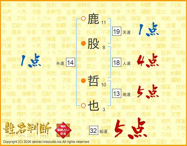 鹿(11画)股(8画) 哲(10画)也(3画)