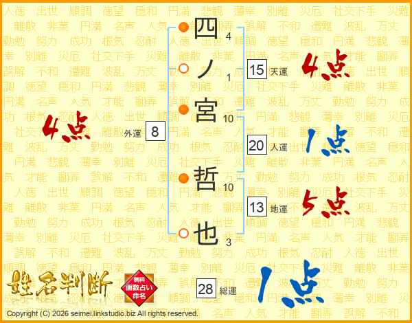 四(4画)ノ(1画)宮(10画) 哲(10画)也(3画)