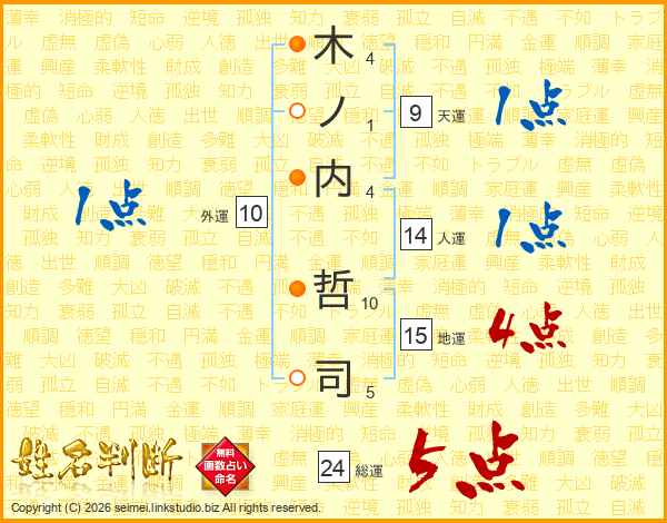 木ノ内哲司さんの総運は24画の5点!