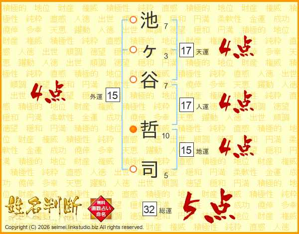 池(7画)ヶ(3画)谷(7画) 哲(10画)司(5画)
