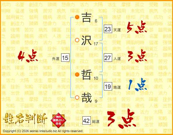 吉(6画)沢(17画) 哲(10画)哉(9画)