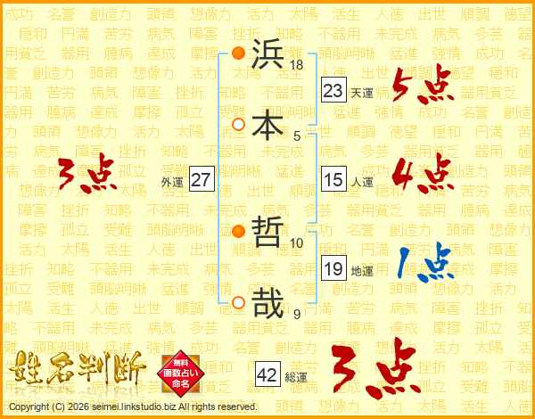 浜(18画)本(5画) 哲(10画)哉(9画)