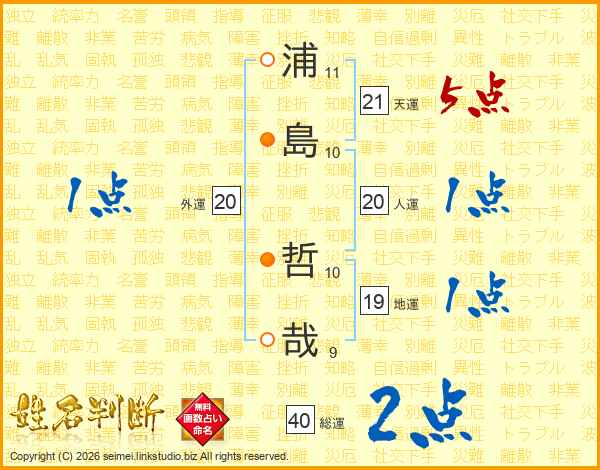 浦(11画)島(10画) 哲(10画)哉(9画)