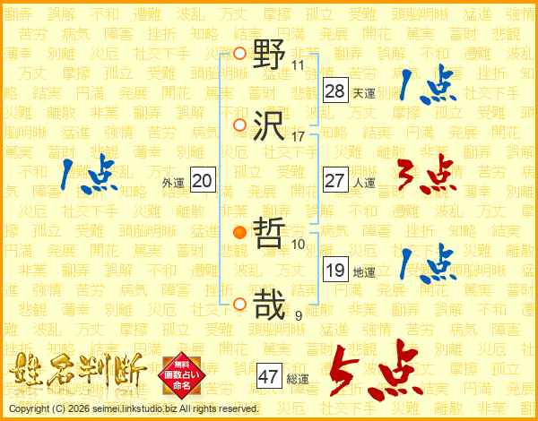野(11画)沢(17画) 哲(10画)哉(9画)