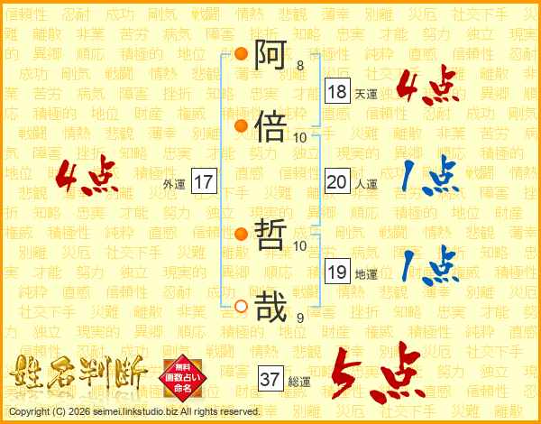 阿(8画)倍(10画) 哲(10画)哉(9画)
